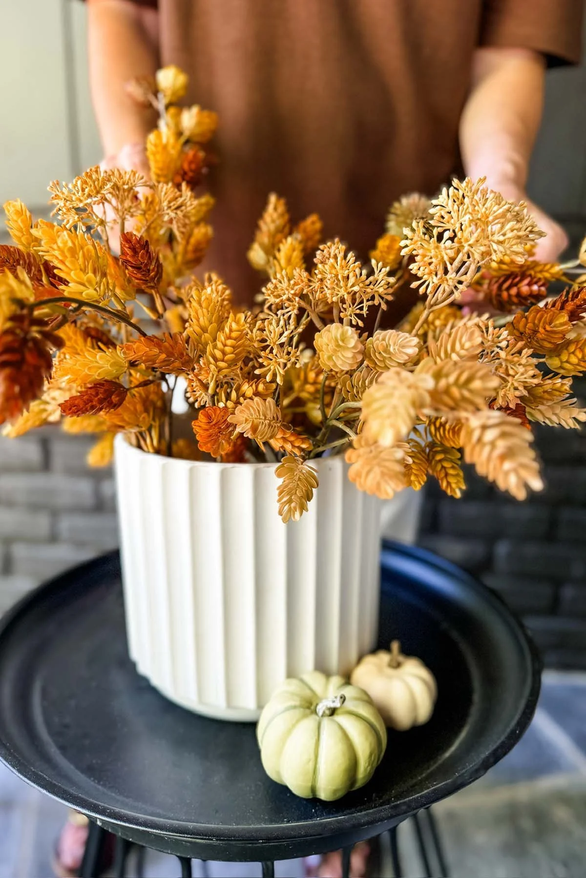 I created this faux fall foliage arrangement using a mix of hops fall stems (similar here and here) as well as a dried floral bundle. I placed them inside this simple, best selling white planter that can be used again in any season, indoors or out.