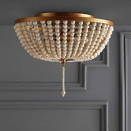 This light fixture has the appeal of a vintage found piece, with neutral-toned wood beads and a glam gold finish on the metal accents.