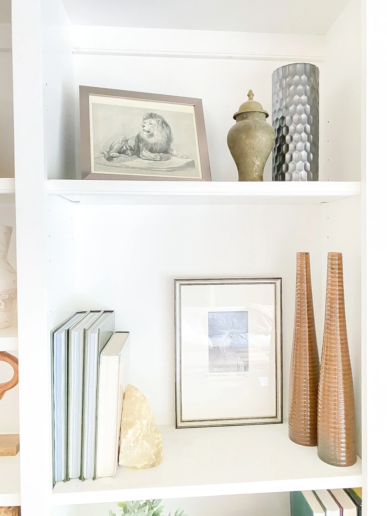 Working in groups of three brings interest to your space. Adding in different elements like frames, accessories, books, sculptures, and more brings interest to your shelf. It’s best to mix things with different sizes. You want to fill the space without overpowering it. I like to think in small, medium, large when selecting my grouping. Arrange your items in odd numbers for an organic and natural look.