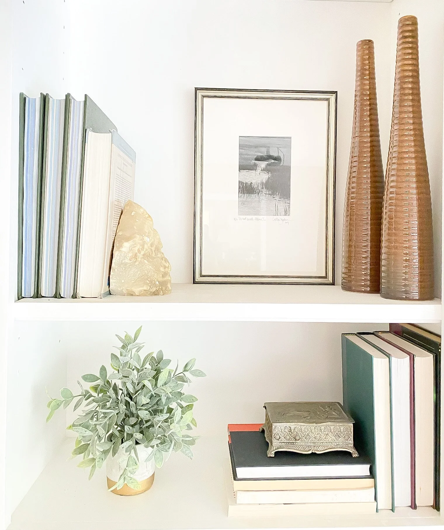 Greenery has a way of tying a space together, so feel free to add all the flowers and plants to your shelves. Real, faux, lively or dried. Just use whatever YOU like. If you don’t have a green thumb or don’t want to have to keep up with a watering schedule, don’t feel pressured to run off to Home Depot to buy tons of house plants. If you are a fan of real plants, then I recommend using trailing plants on your shelves like String of Pearls or Pothos. These plants break the barrier between shelves and add a beautiful new dimension to your space. You can find realistic faux String of Pearls and Pothos if you would prefer an artificial plant. What I love about these plants is they prevent shelves from being so “boxed in” and add movement to a space.