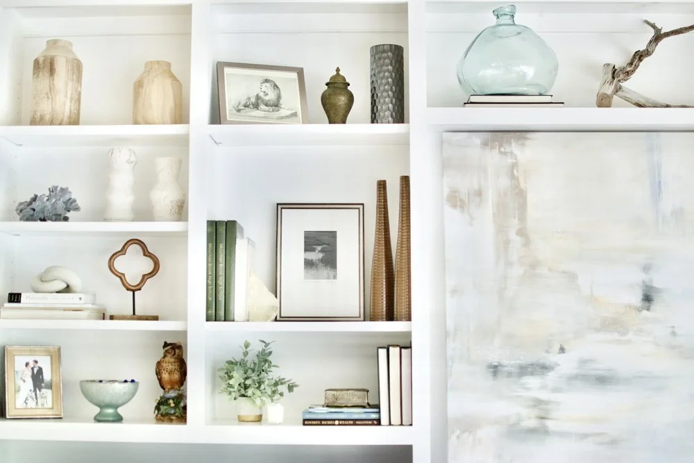 Generally speaking, bookcases or built-ins are not the main decor element of the room. These generally serve as an accent element to your space. If you have a certain color scheme within the room, your bookcases should mimic that palette. You don’t want your shelves to compete with everything else in your space. To create a cohesive look, make sure to bring in elements that work with the existing style. I used lot of neutral accessories and mixed in a little green and blue for my living room built ins. This added to the overall look of the space without overpowering the other design elements.