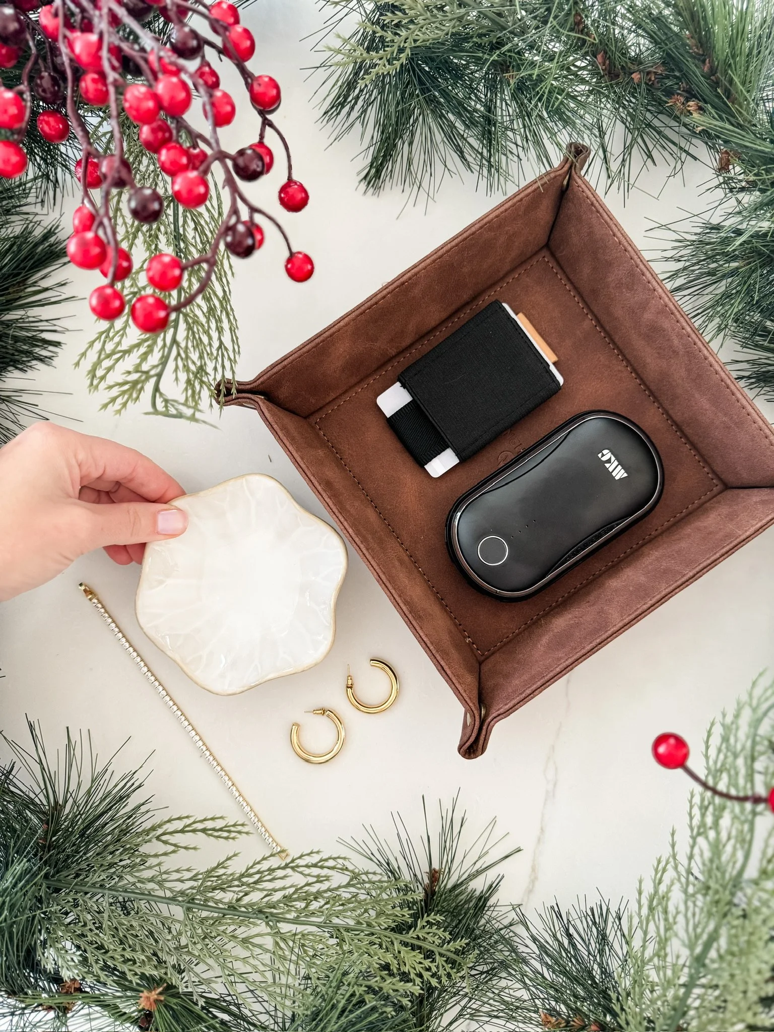I am loving these 6 little items for easy budget friendly gifts this holiday season! Each gift is functional, and would be perfect for the person on your list who already has everything they need. I wear the gold hoops and tennis bracelet all the time, and they are 14k gold plated so they don’t tarnish! They look so cute displayed in the little scalloped jewelry dish as well. We just added the leather valet tray to our entryway table and it is the perfect catchall! My husband owns and loves the elastic wallet and it is the perfect size to slip into a pocket, just like the rechargeable hand warmers! Watch the video below of these great finds.