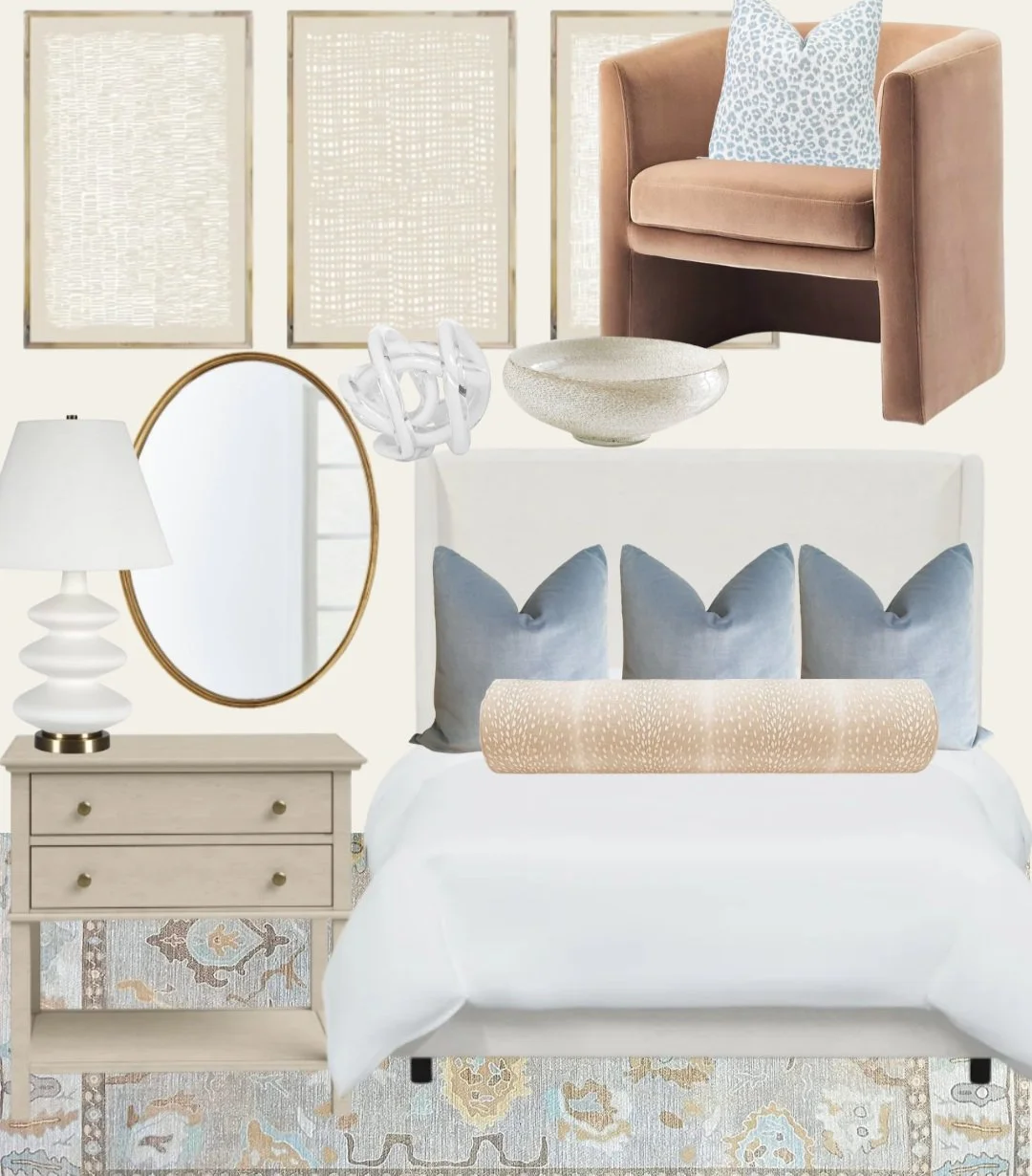 This bedroom is inspired by all my favorite things! Velvet, neutral abstract art, metallic accents and textured pieces. I like to stick to a color palette with one or two pops of color and make the rest neutrals. The textures really help make the space feel unique to you, and I definitely encourage you to play with them! I usually always include a mirror in space to reflect the light and make the space feel bigger, and lighting is super key! I go for warm toned bulbs to make my space feel cozy. Below is the current look I’m loving with pieces from all my favorite retailers like Wayfair, Target, and Amazon.