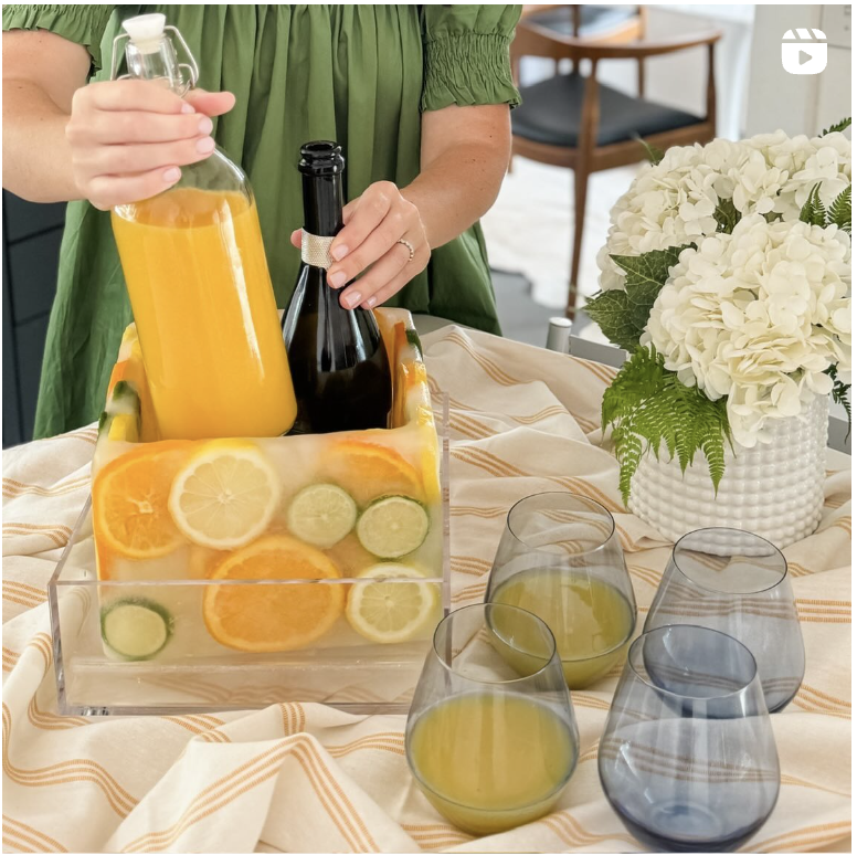 I bought this ice mold last year and have used it many times since! It makes the most fun centerpiece and is fully customizable. I used fresh fruit slices to dress up the look of the ice mold, but you could also use flowers or petals! Just fill the mold with your mix ins and water, and let it freeze overnight. Make sure to take the mold out of the freezer about 30 minutes before serving time to allow the ice to separate from the mold.
