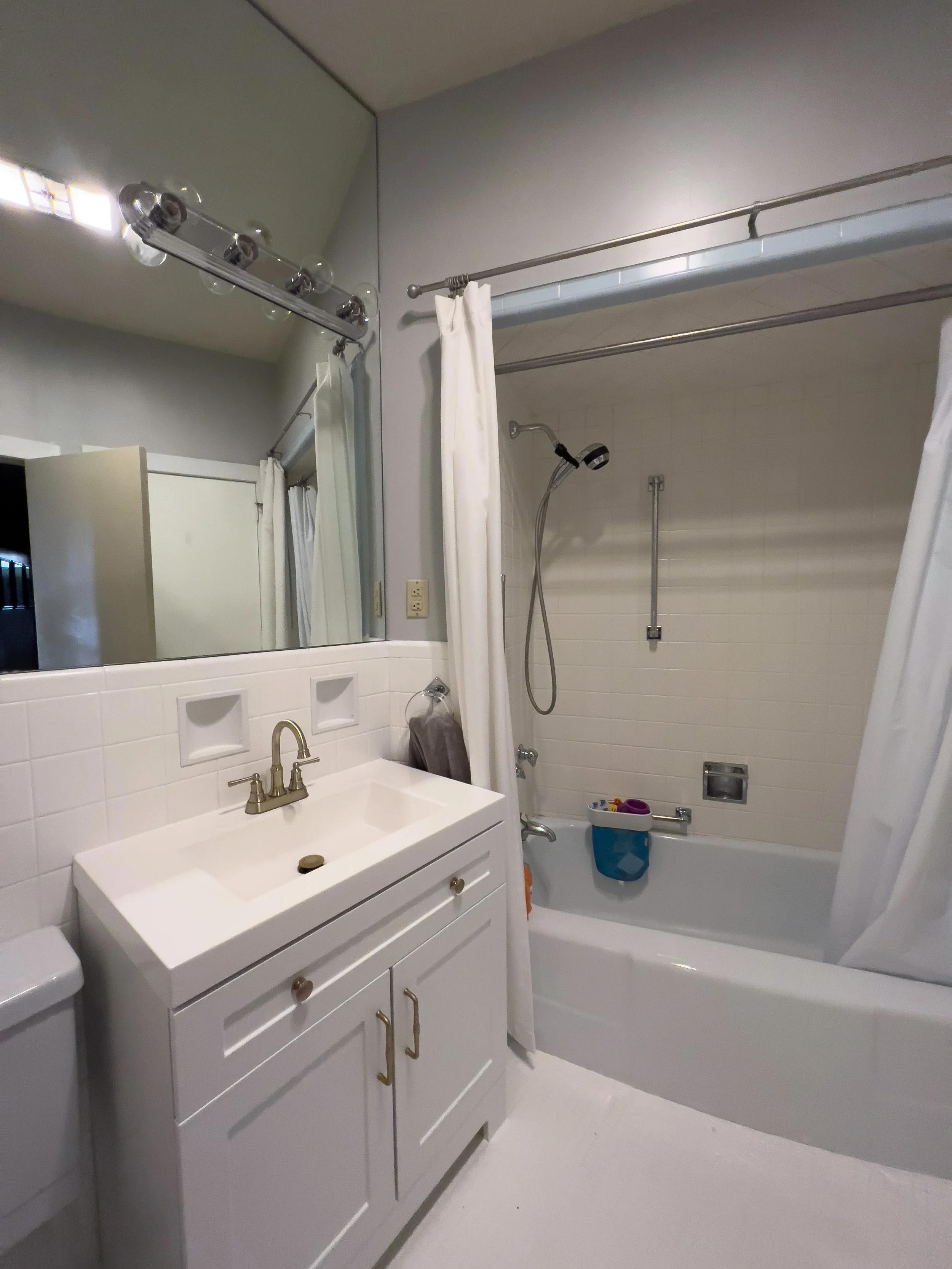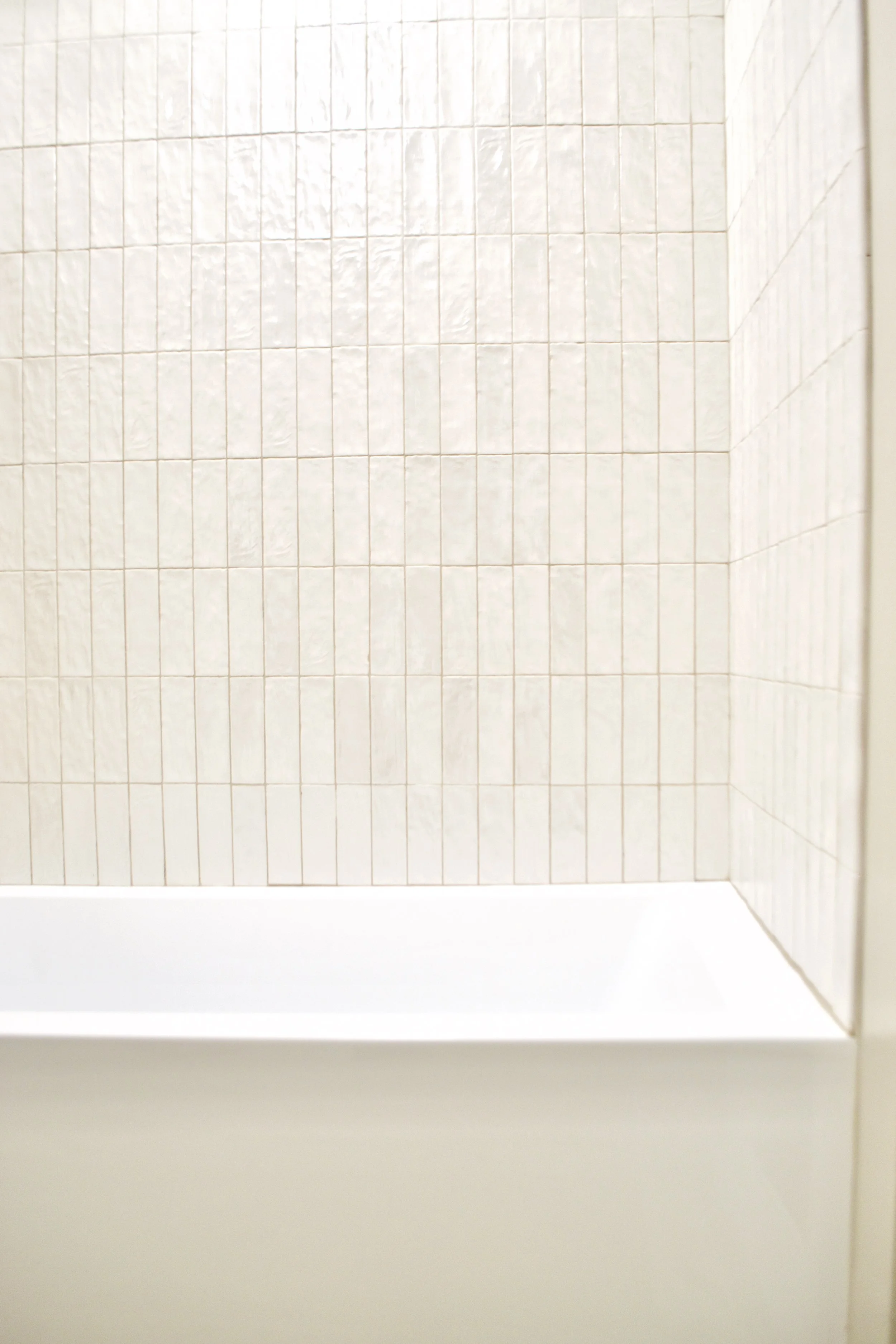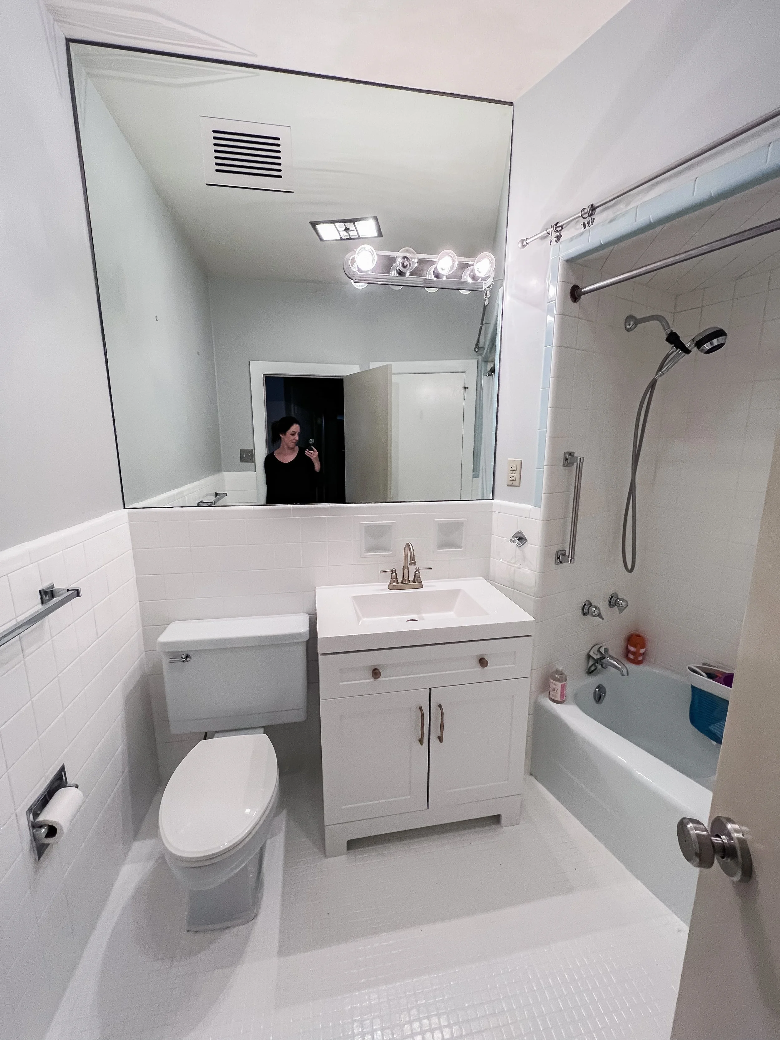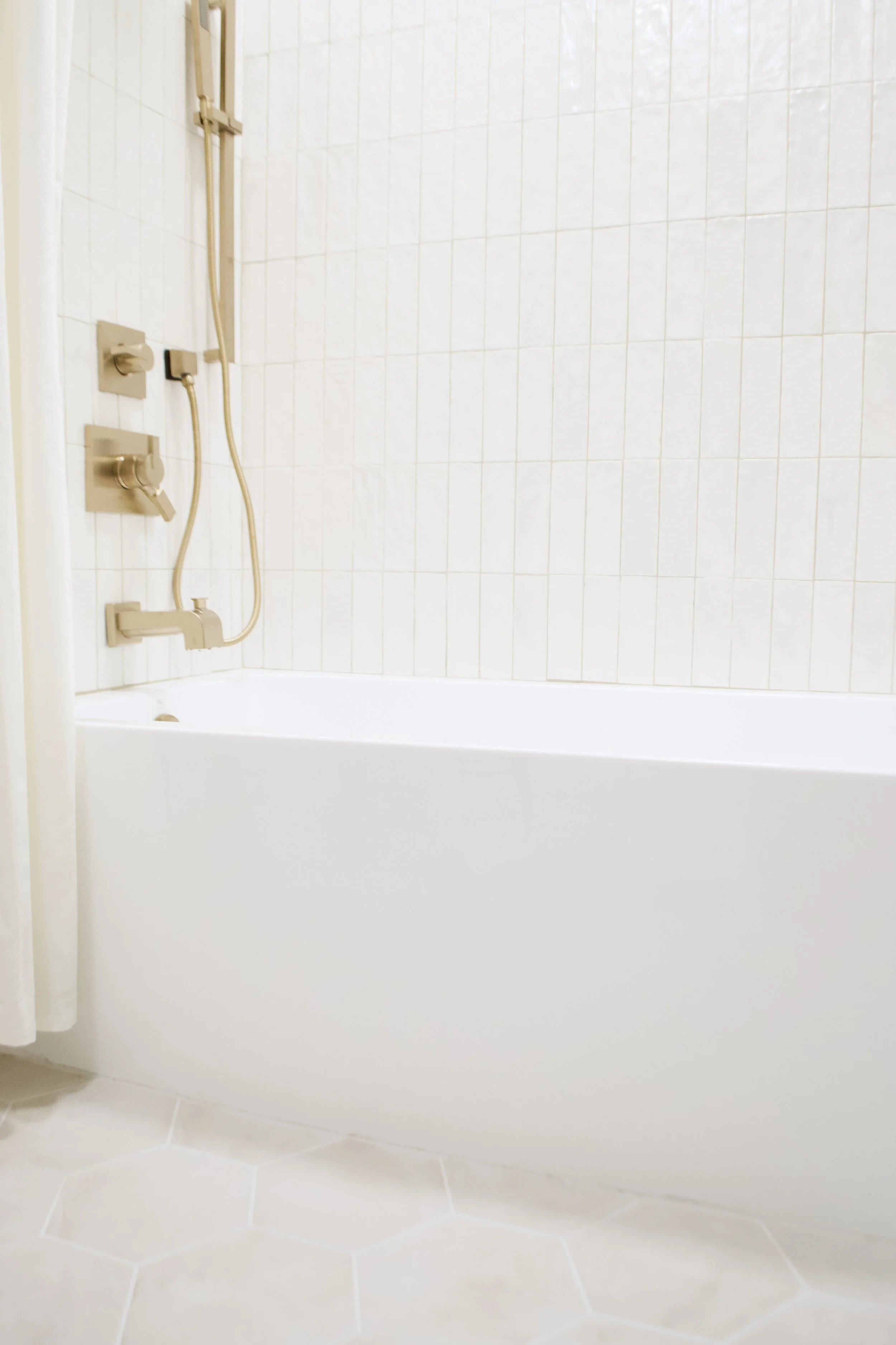 This bathroom has already gone through many changes since we moved in to this house. Recently, we decided it was time to completely gut it and start from scratch. When I found out that Home Depot wanted to work with us on this project, I got started with the planning! This bathroom still had the original white and blue tile from the 50’s and I could not wait to rip out. I found a gorgeous tile that is similar to zellige tiles, which I love, but the Home Depot version fit better into our budget for this particular project. Let’s take a quick walk down memory lane to see what the shower/tub combo looked like before.