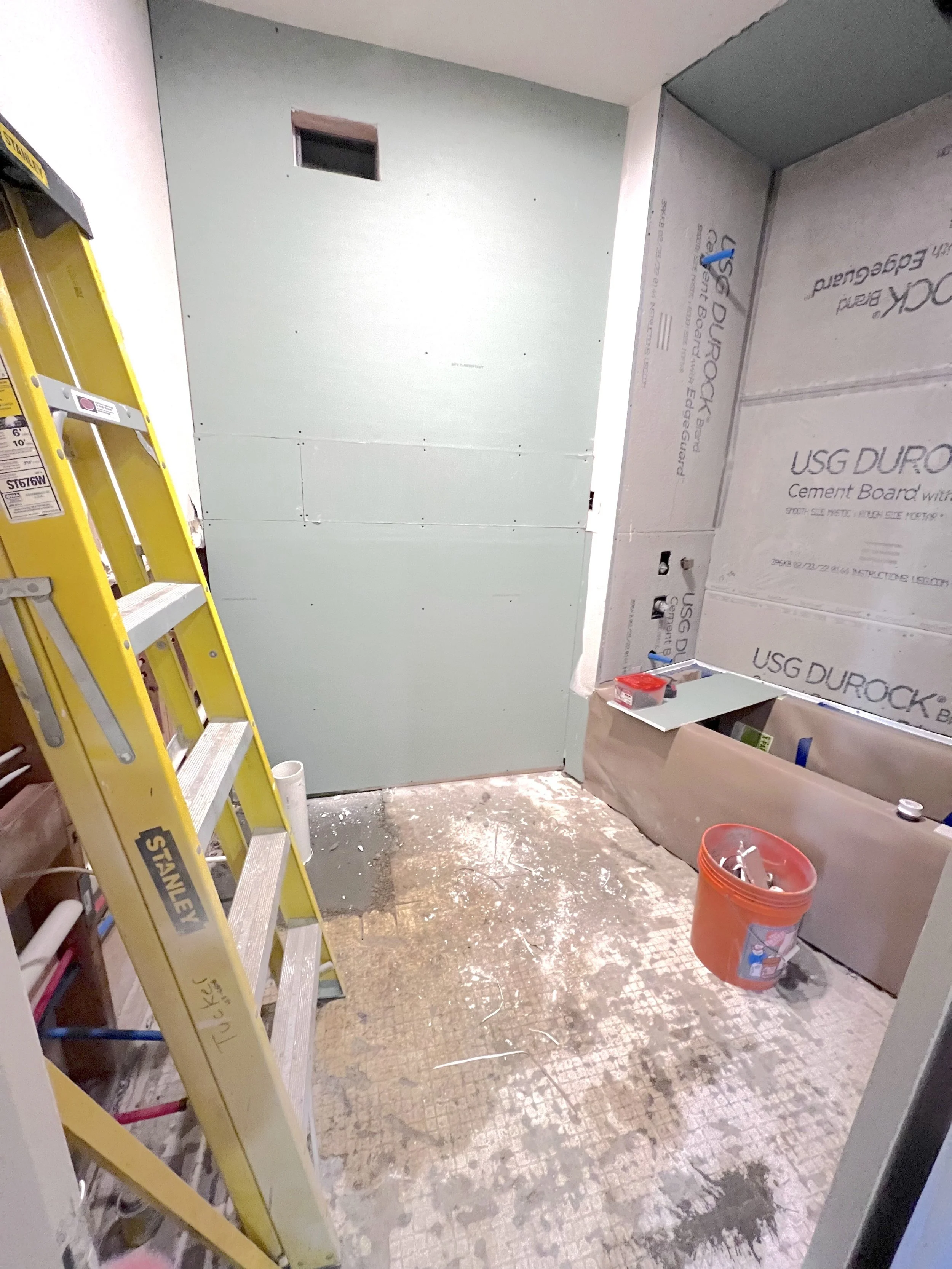 Another thing that took up way too much space... two regular doors. The previous owners used this space as a guest powder bath and bedroom bath. Since we have another powder bath, we decided to wall up the hallway door and make this a private bedroom bath. For the existing door, we decided to install a pocket door and this was the best choice for this space! It made such a difference in the overall functionality. We also chose to move the vanity and toilet space to the wall opposite the bath. This allowed us more room for the vanity. These changes really made the space feel better and it functions so much better that it previously did! Below you will see a few shots of the final project. I will be updating this post with more once our new vanity is in!